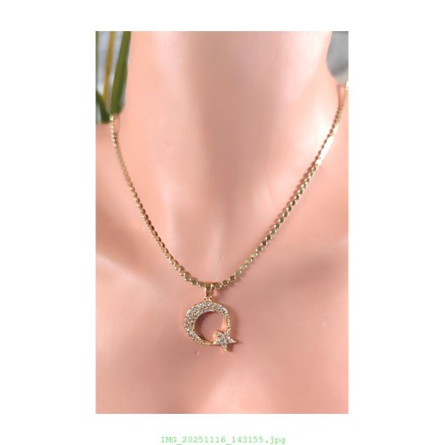 14 K (ALTIN KAPLAMA) ZİRKON TAŞLI HİLAL VE AY MOTİFLİ KOLYE K19Z11